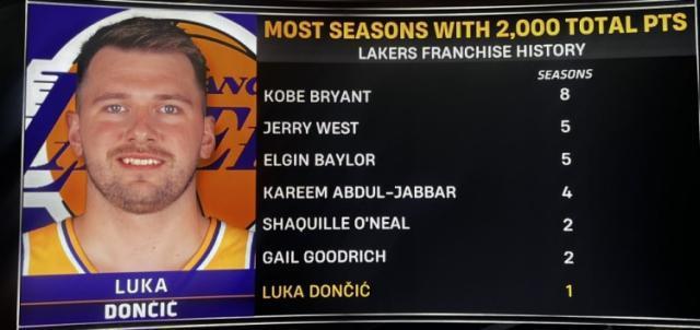 算上这场比赛的32分,东契奇赛季总得分2005分,是湖人队史第七位单赛季得分突破2000分的球员。