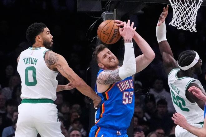 进入第四节比赛,凯尔特人连续两节得分30+,且雷霆本场第二次单节得分不足30分。凯尔特人率先攻防压制逐步扩大14分领先优势,卡鲁索引领雷霆略有反扑追分,但凯尔特人继续保持两位数领先优势,最终雷霆被凯尔特人逆转结束12连胜。