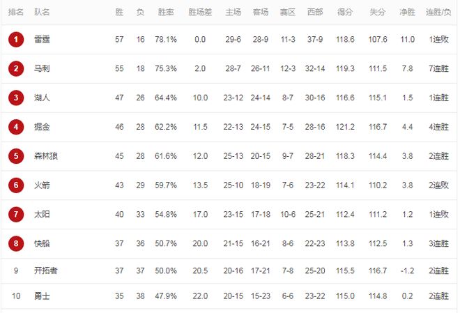 下一个是湖人47胜26负不算特别稳坐第三,领先第四的掘金1.5个胜场。