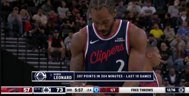 伦纳德过去10场共出战304分钟 ,砍下307分,19战神卡有多恐怖,不用我多说了吧?