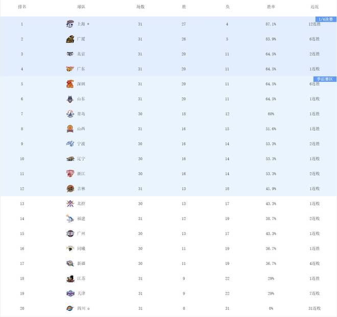 目前,积分榜上半区竞争进入白热化阶段,北京首钢凭借客场逆转广东升至第3,广东滑落至第4,客场负于山西后,山东高速男篮跌至第6位,深圳6连胜后攀升至第5位。