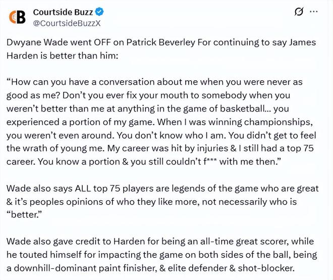 北京时间3月28日,贝弗利近期一直公开表示哈登比韦德更强,甚至说差距不算接近。韦德在播客节目上也做出回应,火力全开。