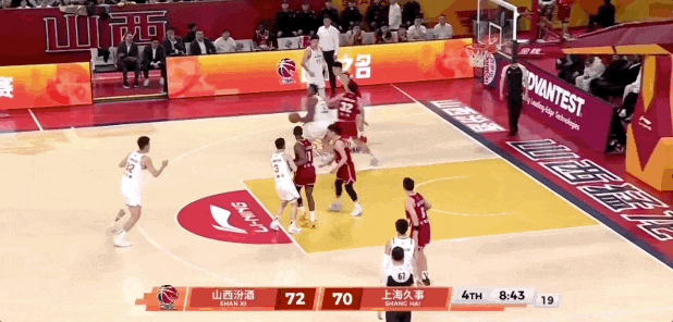 第三节上海男篮的最后一攻,李添荣开边线球,古德温外线接球,面对迪亚洛,干拔三分不进,怀特塞德拿到篮板,传给李添荣,直塞篮下刘礼嘉,后者成功吃饼。