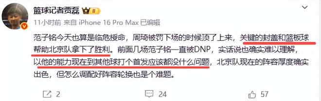 除了许利民的表扬,北京媒体人贾磊也肯定了范子铭的表现。他说,“范子铭今天也算是临危受命,周琦被罚下场的时候顶了上来,关键的封盖和篮板球帮助北京队拿下了胜利。以他的能力现在到其他球打个首发应该都没什么问题。”一个得0分0助1板1帽的队员,得到主帅和媒体人的表扬和肯定,也是很有趣。你们说呢?你对范子铭有怎样的评价?