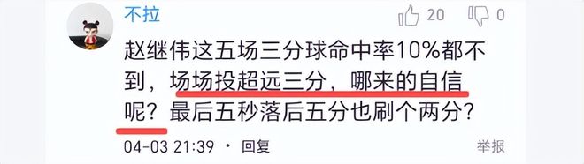 赵继伟打了全队最多的31分钟,除了助攻外,终结能力真差,命中率极低,全场11投2中,三分线外5次出手全部打铁,运动战只得可怜的4分。辽宁球迷说,这场比赛如果赵继伟让出一些球权都不会输。笔者认为,虽然三大国产后卫均拉胯,但是作为队长和国家队主力后卫的赵继续应该承担更大的输球责任,说他是祸首也不为过。