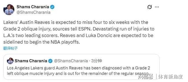 北京时间4月5日,一则令湖人球迷揪心不已的坏消息再度传来!据NBA资深记者Shams的权威报道,湖人队又一位后场悍将里夫斯遭遇了左侧腹斜肌二级拉伤的重创,经专业医疗团队评估,预计他将缺席未来4到6周的赛事。这一伤病不仅意味着里夫斯将无缘本赛季剩余的常规赛,而且极有可能让他错过季后赛首轮的激烈角逐。