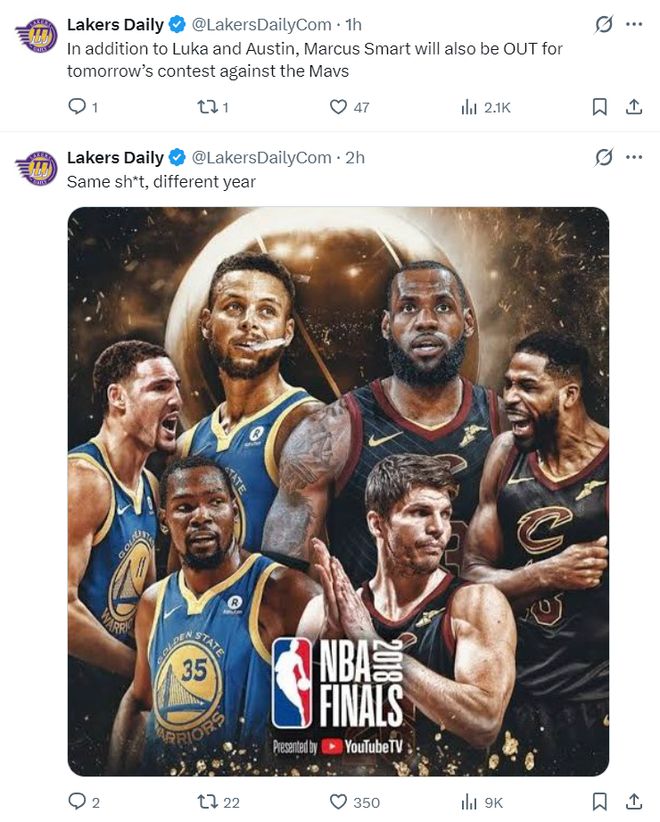 湖媒Lakers Daily又写道:东契奇、里夫斯、斯玛特缺席对阵独行侠,詹姆斯的季后赛似乎又变成了2018年单核对上宇宙勇!
