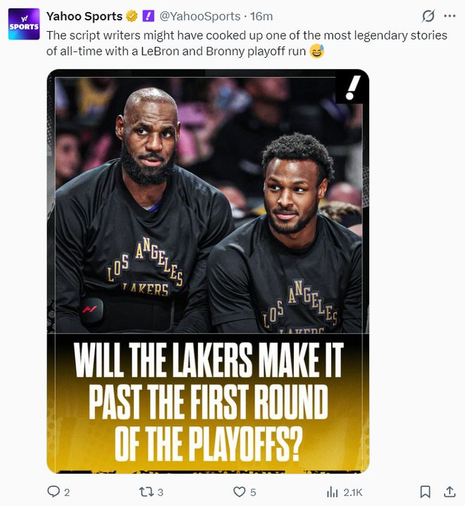 《雅虎体育》还调侃:这些NBA的编剧们创作出了有史以来最传奇的故事之一,湖人季后赛包含了勒布朗与布朗尼的父子同台。