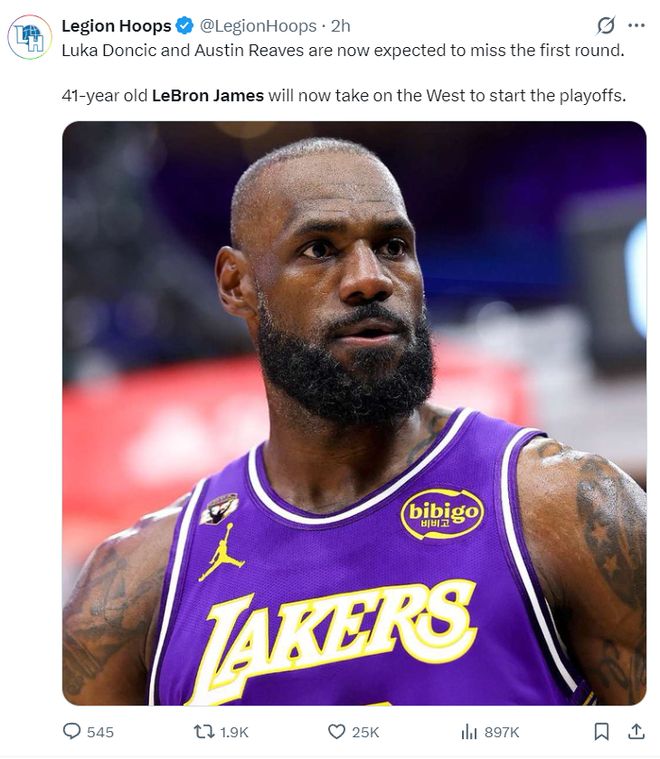 美媒LH写道:东契奇与里夫斯预计将缺席季后赛首轮,41岁的勒布朗将单核带队征战季后赛。