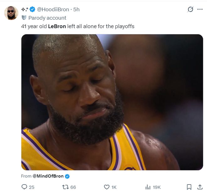 詹姆斯球迷:41岁的勒布朗要单核季后赛。(是詹姆斯摇头闭眼的瞬间)