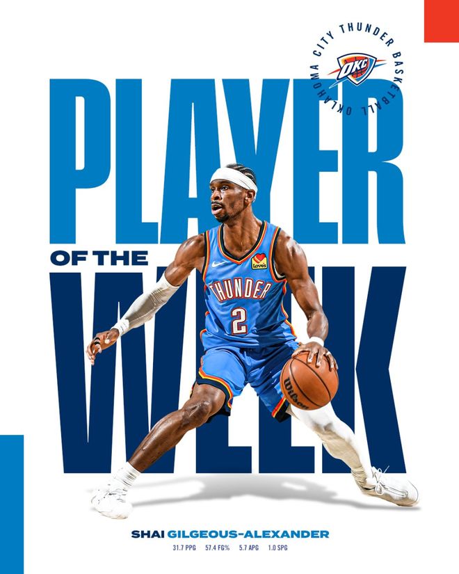 过去一周,亚历山大场均砍下31.7分5.3篮板5.7助攻,帮助雷霆取得3胜0负的战绩。
