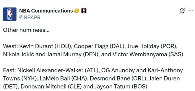 西部:火箭的凯文-杜兰特、独行侠的库珀-弗拉格、开拓者的朱-霍勒迪、掘金的尼古拉-约基奇与贾马尔-穆雷、马刺的维克托-文班亚马。