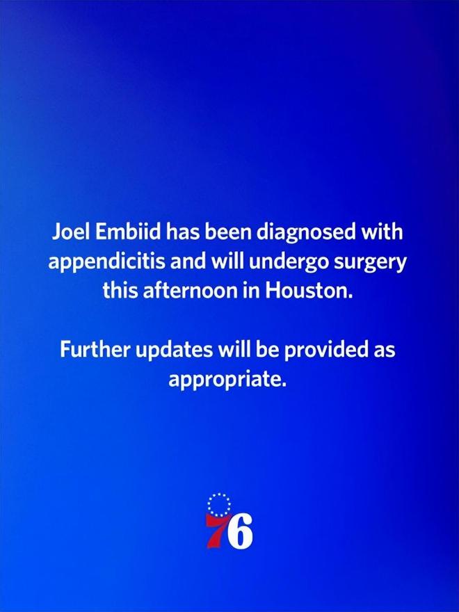 北京时间4月10日,费城76人队球星中锋乔尔-恩比德今日在休斯顿接受紧急手术。在这场常规赛关键战对阵火箭前的几个小时,他被确诊为急性阑尾炎。