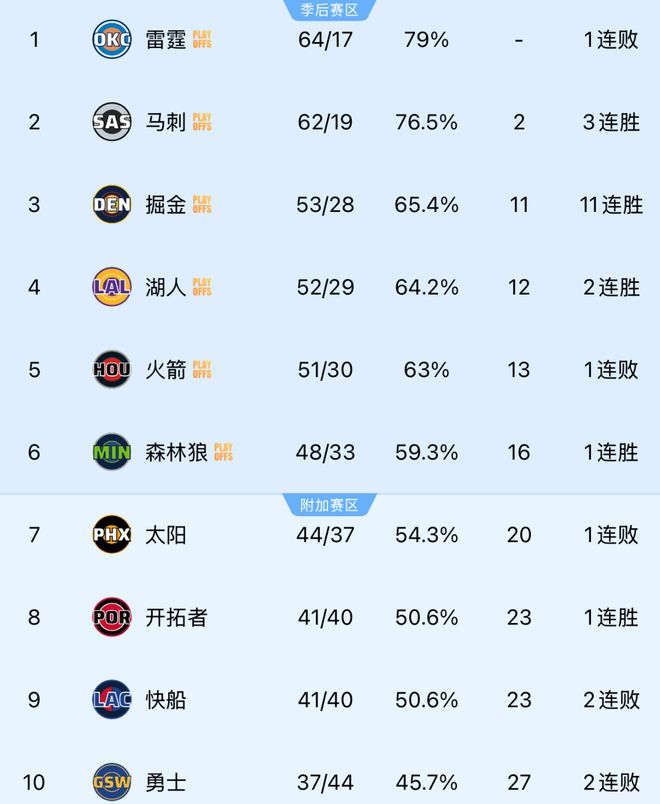 因此,西部前10大概会是雷霆、马刺、掘金、湖人、火箭、森林狼、太阳、开拓者、快船以及勇士,湖人首轮对火箭。大家认为呢?