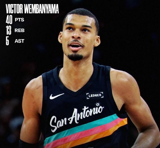 4月11日,马刺139比120大胜独行侠,本场比赛,马刺球员文班亚马出战26分钟,全场23投14中,三分球7投2中,贡献40分13篮板5助攻!