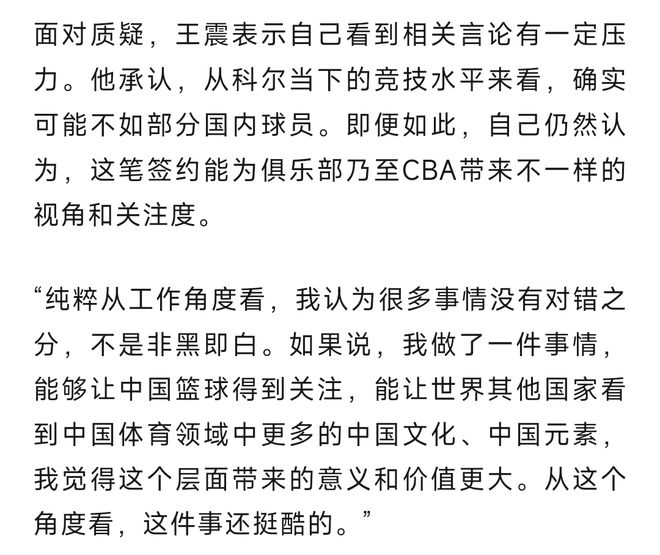 王震表示他承认J.Cole当下的竞技水平确实不如职业球员,但即便如此,这笔签约能为俱乐部乃至CBA带来不一样的关注度。