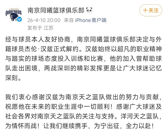 所以,为了J.Cole能正儿八经上场,南京还裁掉了外援 杰伦·汉兹。(南京之前已经有四位外援了)