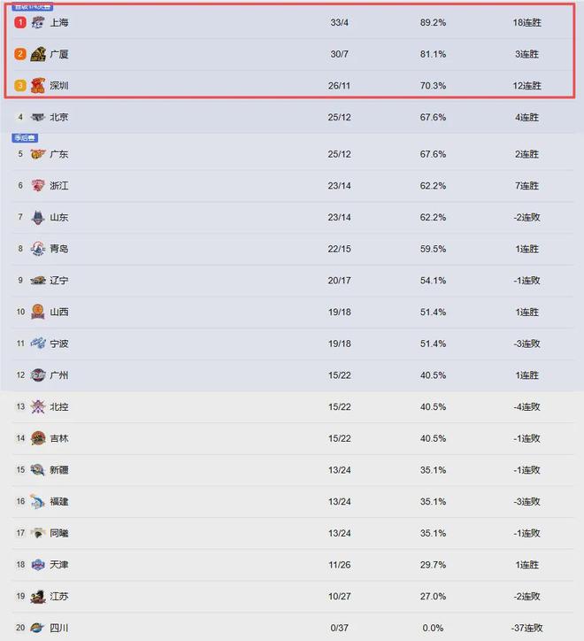 第二个消息,随着38轮常规赛到来,距离季后赛也就剩下最后5轮,而整体的季后赛分组格局已经清晰了。上一轮深圳战胜江苏拿下12连胜,浙江也是大胜山东收下一波7连胜,广州在击败同曦后排名升至第12,。故此,我简单给大家梳理一下。