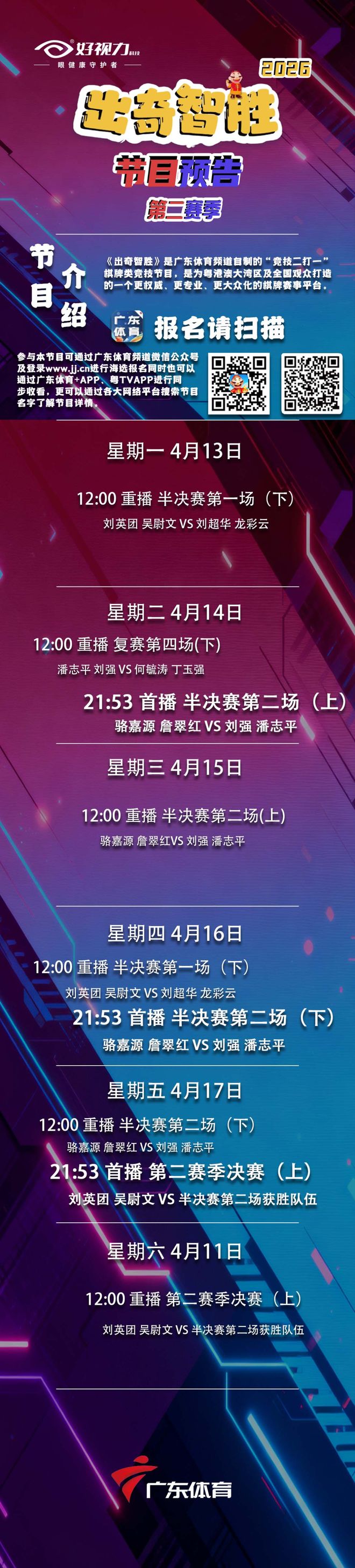 《出奇智胜》将进入2026年度第二赛季的决赛周阶段,刘英团、吴尉文队伍以黑马之姿成功突围,最终成为本赛季第一支晋级决赛的队伍。即将进行的第二场半决赛中,谁又能斩获第二张决赛门票?同时下周更将开启第二赛季决赛之战的序幕,且看群雄逐鹿,谁将问鼎冠军宝座,精彩赛事尽在《出奇智胜》!