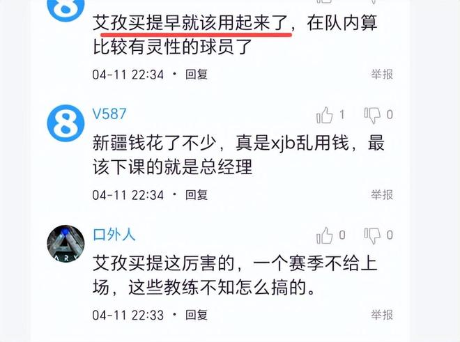 从艾孜麦提这件事看来,我们的教练不应该瞧不起队员,而应是敢于使用,坚持使用,他总有一天找到最佳状态。姜正秀就是这样知人善任的好教练。新疆球迷说,“扶正姜正秀带的不错,说实话他是最了解队员的那个人”、“艾孜买提这么厉害的,一个赛季不给上场,这些教练不知怎么搞的”、“艾孜买提早就该用起来了,在队内算比较有灵性的球员了”。诸位,看到艾孜麦提从无球可打,到彻底爆发,你有怎样的评论?