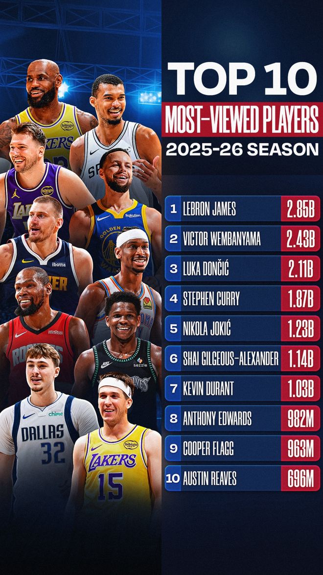 另外,NBA官方宣布,詹姆斯以28.5亿的播放量登顶2025-26赛季NBA社媒与数字平台球员热度观看榜榜首。马刺球星文班亚马以24.3亿播放量位居第二,詹姆斯的队友东契奇以21.1亿位列第三,里夫斯6.96亿排名第十。湖人三位球星都进入前十。