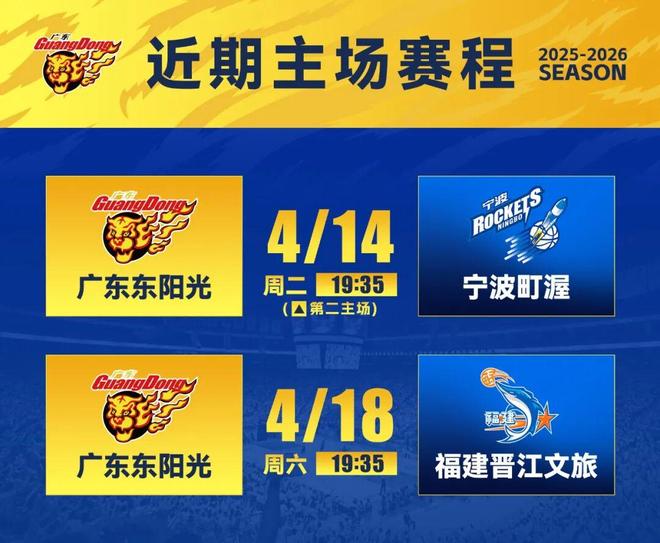 4月14日,CBA常规赛第39轮,广东东阳光将重返第二主场(顺德德胜体育中心体育馆),与宁波町渥男篮展开二番战。双方在第22轮有过一次交手,华南虎客场告负。