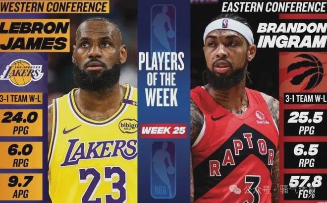 4月14日,NBA官方公布本赛季第25周东西部周最佳球员,其中湖人球员詹姆斯成为西部周最佳球员。