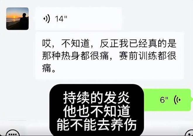 “不知道,反正我已经真的是那种热身都很痛,赛前训练都很痛”。如果不是实在到了无法忍受的地步,胡明轩是不可能允许别人将这段对话晒到网上,向俱乐部施压的。