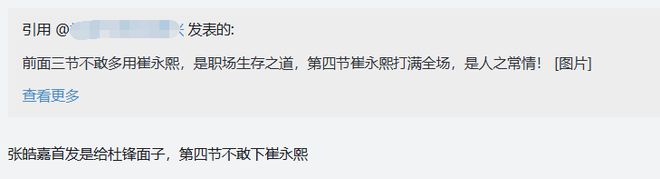赛后评论区有球迷对本场比赛拉科维奇的用人变阵做了一个精准的总结:前面三节不敢多用崔永熙,是职场生存之道,第四节崔永熙打满全场,是人之常情!
