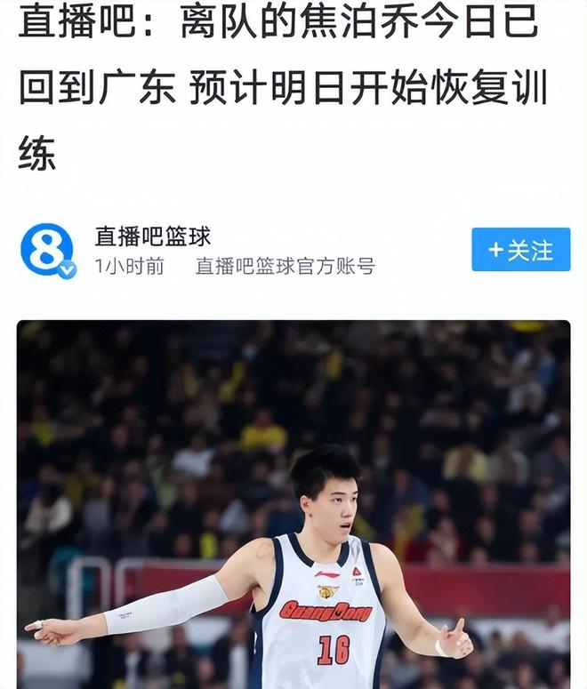 最近这几天关于焦泊乔归队的消息一直不断,本轮赛后据直播吧官方消息,此前提出离队进行调整的焦泊乔,已经回到了广东,预计明日开始恢复训练。