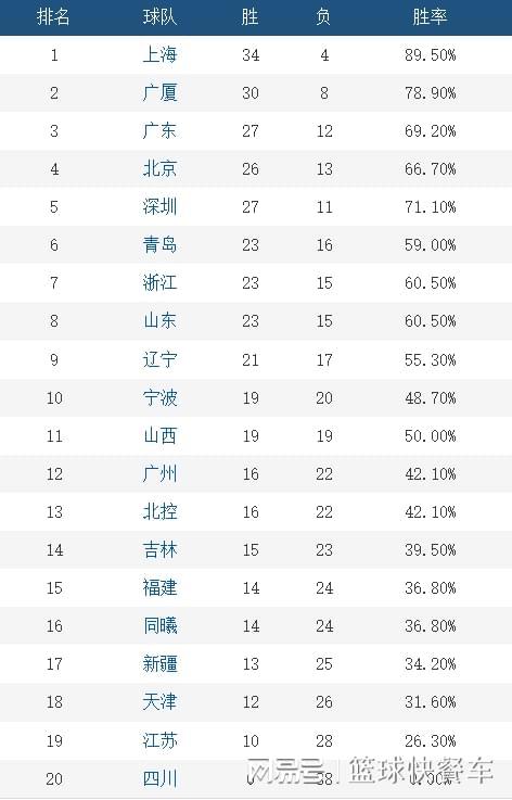积分榜第6名则属于青岛队,这一场比赛他们虽然输球,不过,球队的战绩变成23胜16负,上升到积分榜第6名,浙江队则排在积分榜第7名,他们的战绩为23胜15负,而第8名则是山东队,战绩也是23胜15负,这两队也是因为少赛一场的缘故,在排名上稍微吃亏。而积分榜第9名则属于辽宁队,他们已经拿到21胜17负的战绩,以上9支球队全都锁定季后赛了。