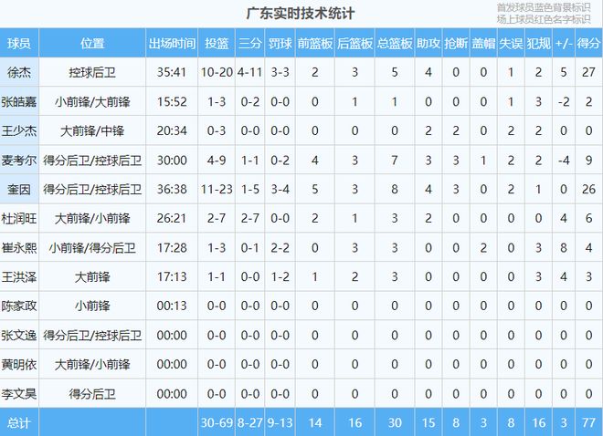 赛后,广东队球员数据统计:徐杰27分5板4助、奎因26分8板4助3断、麦考尔9分7板3助3断、杜润旺6分3板2助、崔永熙4分3板2帽、王洪泽3分3板、张皓嘉2分1板、王少杰2助2断。