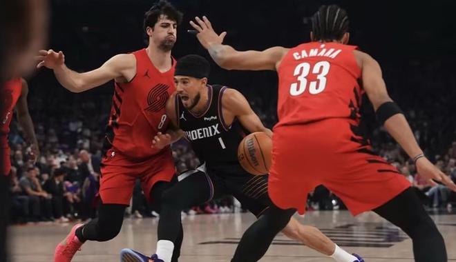 下半场回来布克很快吹到个人第4次犯规不得不下场休息,太阳队的尺寸太吃亏了,开拓者抓住机会一波10-2小高潮重新建立双位数领先,吉莱斯皮三分飚中太阳咬住比分,撑到布克回来后太阳进攻得以持续,反观开拓者年轻球队稳定性不足的缺点暴露出来,单节比赛太阳追回2分,带着1分劣势进入第四节。末节一上来狄龙开始发力,连续打出精彩攻防转换,太阳反而领先了10分,危险时刻老将霍乐迪、格兰特站出来联手命中三个三分球,阿夫迪亚回来后连续硬解球,布克关键两罚一中,古德温2+1罚球也没有,机会给到了开拓者,阿夫迪亚关键2+1狄龙被打到6犯离场,暂停过后杰伦格林三分线外三分绝杀失败,开拓者控制球权比赛结束!最终太阳主场110-114不敌开拓者!此役过后西部季后赛首轮三组对决出炉,马刺首轮对阵开拓者,湖人对阵火箭,掘金打森林狼!