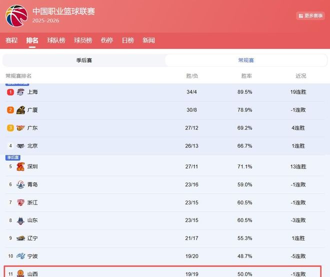 据CBA官方最新积分榜(截至4月14日)显示,山西队当前战绩为19胜19负,位列第11位,恰好悬于季后赛附加赛资格线之上;身后吉林、北控仅落后1个胜场,胜负关系稍有闪失,即刻出局。