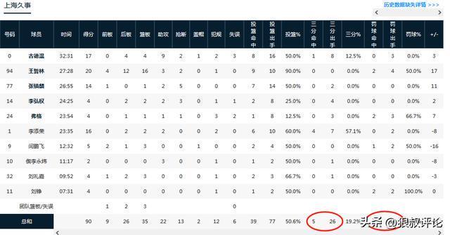 全队的三分投篮命中率为26投5中,命中率只有19.2%,除了李添荣交出了7中4外,古德温8中1,其他球员并没有投中三分,罚球命中率方面,全队为16罚7中,命中率只有43.6%。