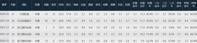 这哥们出生于1997年12月31日,身高2米10&体重103公斤,拥有一定的投篮能力,CBA生涯至今场均出战20.7分钟贡献14分8.1板1.8助1.1断1帽,场均以26.1%命中率扔进0.5记三分球。