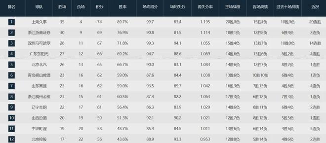 目前广东队以27胜12负战绩排名联盟第四,北京队26胜13负第五紧随其后,前三名分别为上海队(35-4)、卫冕冠军广厦队(30-9)和深圳队(28-11)。
