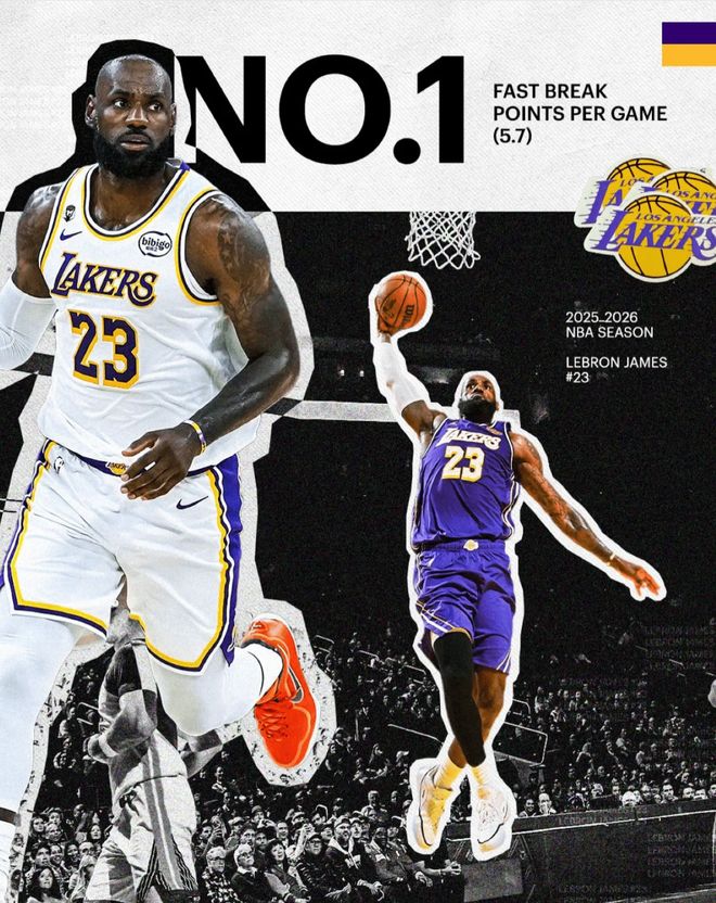 湖人官方在这一天还晒出了勒布朗本赛季场均快攻5.7分联盟第一,今年12月就要年满42岁的老将在这项数据上还能独占鳌头足以证明他仍在巅峰。