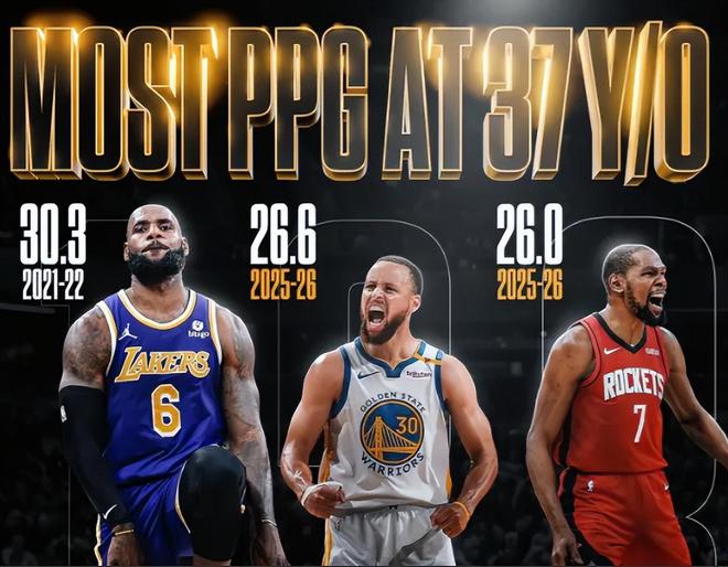 美媒BF晒出37岁三位超巨的场均数据也能说明勒布朗有多强,21-22赛季的勒布朗场均30.3分,25-26赛季的库里26.6分、杜兰特26分,所以37岁的勒布朗依旧是最恐怖的存在。