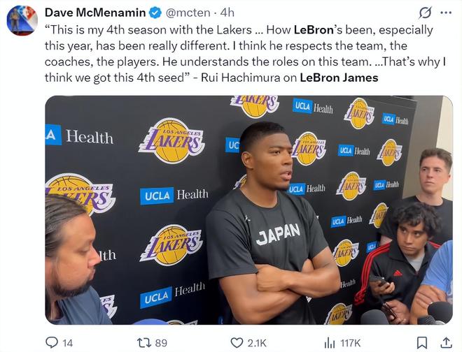 八村垒谈到詹姆斯:这已经是我来到湖人的第四年,现在看到勒布朗的状态真的很不一样,我觉得他非常尊重球队、教练、队友,他也清楚自己在这支球队扮演的角色,这也是我们能排在西部上半区的关键。