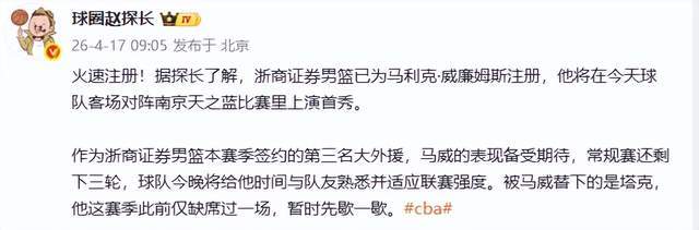 北京时间4月17日消息,浙江广厦客场负于山西男篮后,主教练王博因情绪失控冲入场内被驱逐,球队近期接连受挫,士气遭遇严峻考验。为补强内线短板,广厦官方正式宣布签下身高2米13、臂展出众且具备三分投射能力的大外援马利克·威姆斯,其大概率将取代表现低迷的卡尔顿,于4月17日19:30客场对阵南京同曦的比赛中迎来CBA首秀。