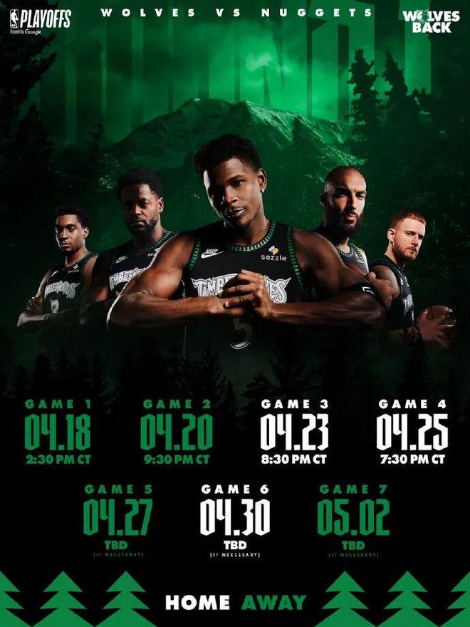 掘金打森林狼,比赛的间隔时间:1天、2天、1天、1天、 2天 、1天,大部分都是打一休一,符合以往季后赛首轮的比赛节奏。