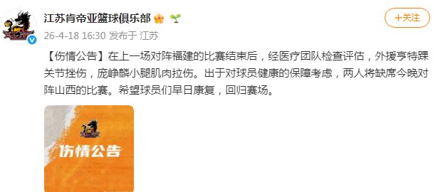 北京时间4月18日,江苏男篮官宣最新的伤病报告,球队后场双核庞峥麟与亨特均是遭遇伤病侵袭,他们均将缺席本日与山西男篮的比赛。