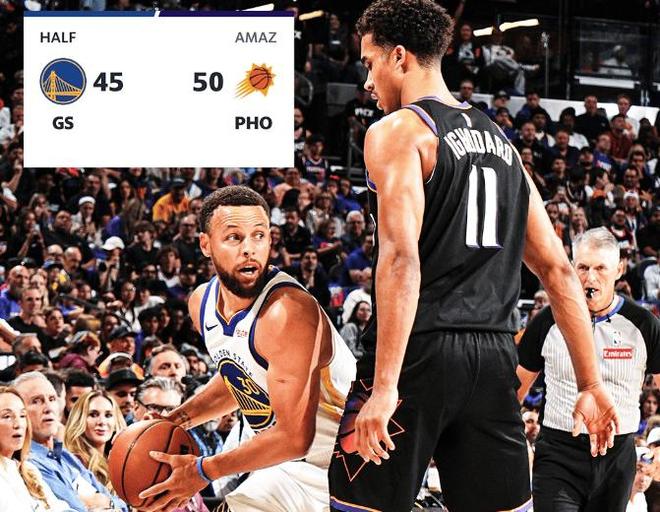 首节比赛后半程,勇士继续崩盘,库里还没得到什么出手机会,太阳这边则全民皆兵,将领先优势扩大到15分以上,第一节比赛结束,太阳33-15领先勇士18分。次节比赛开始,波杰姆斯基空切篮下挑篮得手,帮助勇士先下一城,小佩顿踏雪无痕抢到进攻篮板,飞身补篮稳稳命中,追梦格林长驱直入,面筐冲击篮下再拿两分,伊戈达罗背身单打,转身过掉防守震荡灌篮轻松命中,霍福德篮下坐打,急速上篮又斩落两分。此后一段时间,场上局面风雨突变,勇士在进攻端渐入佳境,波杰姆斯基冲击力十足,连续面筐突破上篮得手,库里也飙进侧翼三分球。