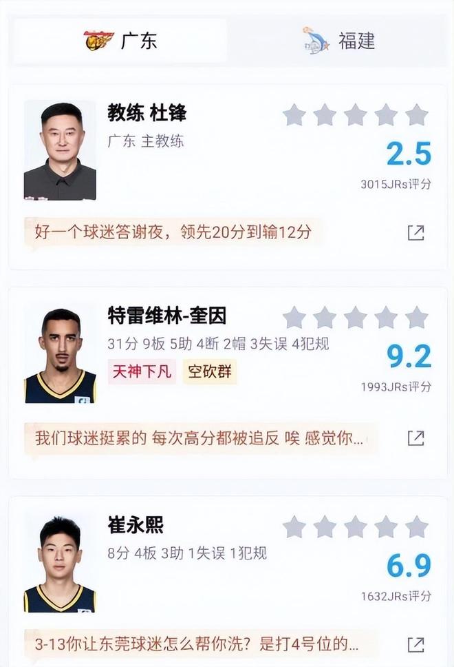 这场比赛结束后,超过1.4万的球迷对球员进行了评分,杜锋和杜润旺的评分最低,只有2.5分和2.6分。杜锋的问题就不多说了,这段时间球迷们已经讨论得够多了,他在战术和用人方面非常固执。杜润旺作为一名投手,这场比赛打了16分钟没有得分进账,而且防守的问题非常明显,在场上几乎可以说是负作用了,评分比较低也很正常。另外小将陈家政这场比赛的表现也不好,防守端的问题很大,接下来需要好好总结。