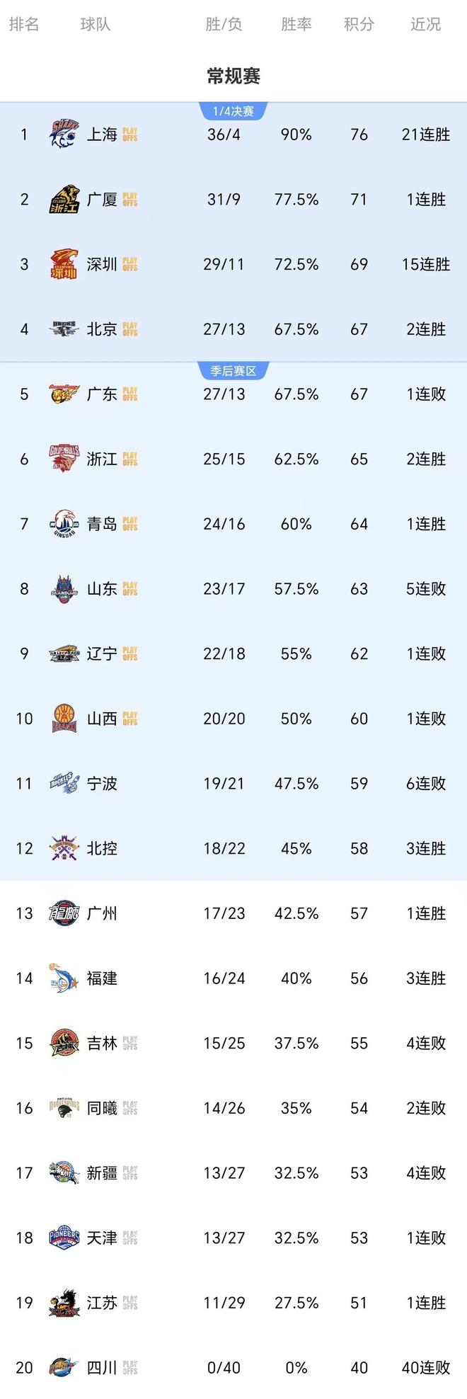 广东队提前锁定季后赛席位,但争四还不稳,福建队还要竞争季后赛席位,最后三轮必须保持全胜才有希望。