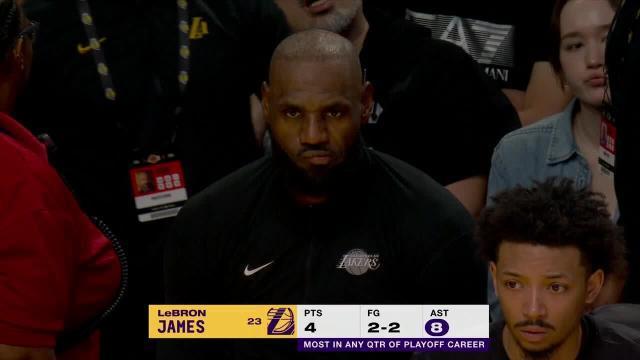 北京时间4月19日,湖人主场迎来和火箭的系列赛首战。第一节打完,湖人33比29领先,41岁的勒布朗·詹姆斯再创新高,单节送出8次助攻,这不仅是他本赛季单节助攻的新纪录,也是他293场生涯季后赛中的单节助攻新高!另外,这也是有单节数据统计以来,湖人队史的季后赛单节助攻纪录。