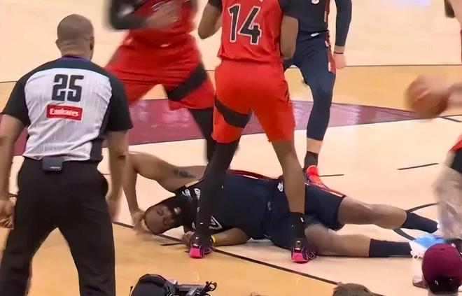 最令人揪心的一幕发生在第三节中段:哈登持球推进遭遇三人包夹,慢镜头清晰还原全过程——前侧球员伸手拽住其球衣,侧翼球员死死箍住其右臂,身后博伊尔斯更以小臂及肘部猛烈撞击哈登后颈,致其重心尽失、重重摔倒在地,面部浮现明显痛感,但近在咫尺的主裁未作任何反应,比赛照常进行。