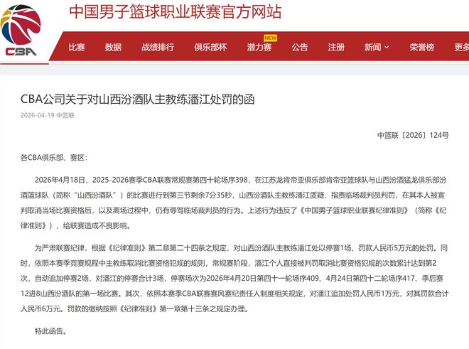 CBA公司给潘江开出了1份大罚单!