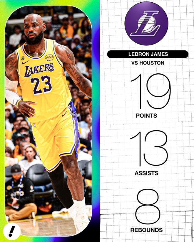 湖人先发五虎得分都上双,全队29次助攻勒布朗这位41岁的老头就贡献了13次接近一半。全场比赛詹姆斯出战38分26秒,15中9,三分2中1,拿到19分13助攻8篮板2抢断1盖帽(首节8助攻、半场10助攻)。